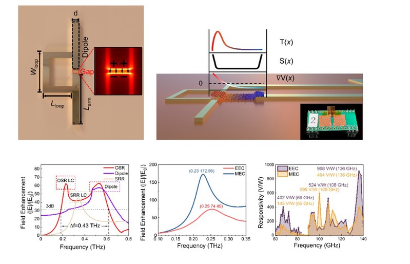 近日,上海理工大学庄松林院士领导的太赫兹技术创新研究院提出了一种可在室温下工作的自供电宽带快速响应的柔性太赫兹探测器。该探测器充分利用柔性材料聚酰亚胺的低损耗和石墨烯的高电子迁移率,并引入Ω型劈裂环(OSR)天线,实现基于光热电效应的宽带和超灵敏的太赫兹响应。该研究成果以《Giant Broadband Electric Field Enhancement Mediated by Ω–Shaped Antenna and Its Application on Ultrasensitive Terahertz Detectors》为题,发表在《Laser & Photonics Reviews》杂志上(IF=10,中科院一区)。论文第一作者为硕士生张浔林,通讯作者为朱亦鸣教授,郭旭光研究员。 本研究针对传统太赫兹光热电探测器在天线增益与带宽之间难以兼顾的瓶颈问题,创新性地提出了一种OSR天线。该结构通过**调控环路尺寸与偶极子臂长度,实现了对电感-电容(LC)谐振与偶极谐振频率的自由调控。研究发现,在常规电激励构型下,得益于两种模式的协同效应,OSR天线在0.4 THz的带宽范围内实现了超过40倍的局部电场增强;而在磁激励构型下,OSR天线馈电间隙处的场强相较于电激励构型下提升了一倍。结合OSR天线在馈电间隙处显著的电场增强效应、柔性材料聚酰亚胺的低损耗特性与石墨烯的高载流子迁移率等特性,在室温和零偏压模式下,该器件在太赫兹频段表现出卓越的探测性能:电压响应度最高可达到908 V/W,噪声等效功率低至5.8 pW/√Hz,响应时间仅为8 μs。实验结果表明,该工作不仅为研制超灵敏、宽带的柔性太赫兹感知器件奠定了坚实的理论与实验基础,也为未来下一代太赫兹高速通信、实时成像等领域开辟了广阔的应用前景。